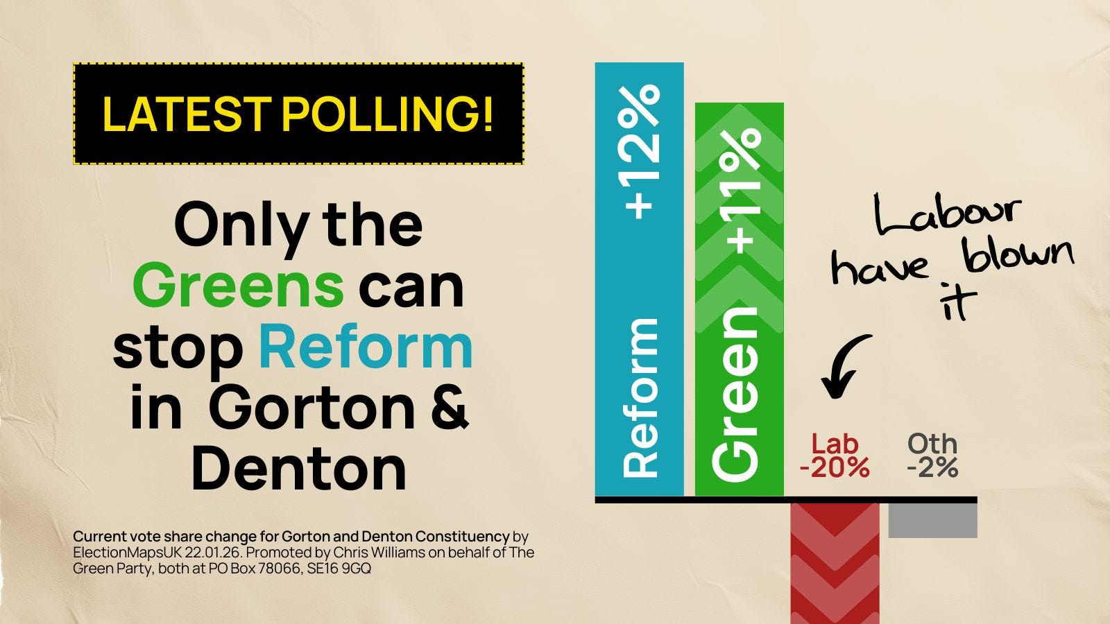 The Greens can at least claim they are not alone in torturing statistical models to muddle voters. Labour have also put out a dodgy bar chart graphic - one so familiar in format I wonder if the Lib Dems might consider a plagiarism case - claiming “only Labour can beat Reform”. This is based on a similar statistical model as the Greens’ graphic, thus providing a nice illustration of how the same data can, with a little imagination, be encouraged to tell quite different stories. All this provides a useful case study in the abuse of graphs for my future statistical methods classes but is not much help for a Gorton & Denton voter seeking to understand the state of the race.
