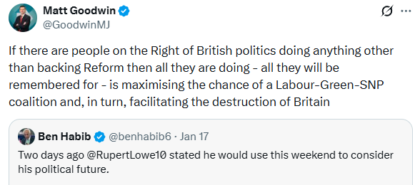 Buckley, though unlikely to win, poses a major headache for Reform: a candidate with the same political offer as Matthew Goodwin but with stronger local credentials and electoral experience. One person well aware of the dangers of a split on the right is Goodwin himself - just two weeks ago he attacked Advance leader Ben Habib as a splitter on Twitter, saying “people on the Right of British politics” doing anything other than backing Reform” were “facilitating the destruction of Britain.” Habib replied “Reform has become part of the problem.” Goodwin may come to regret these online spats with Habib if Advance takes votes Reform can ill afford to lose.