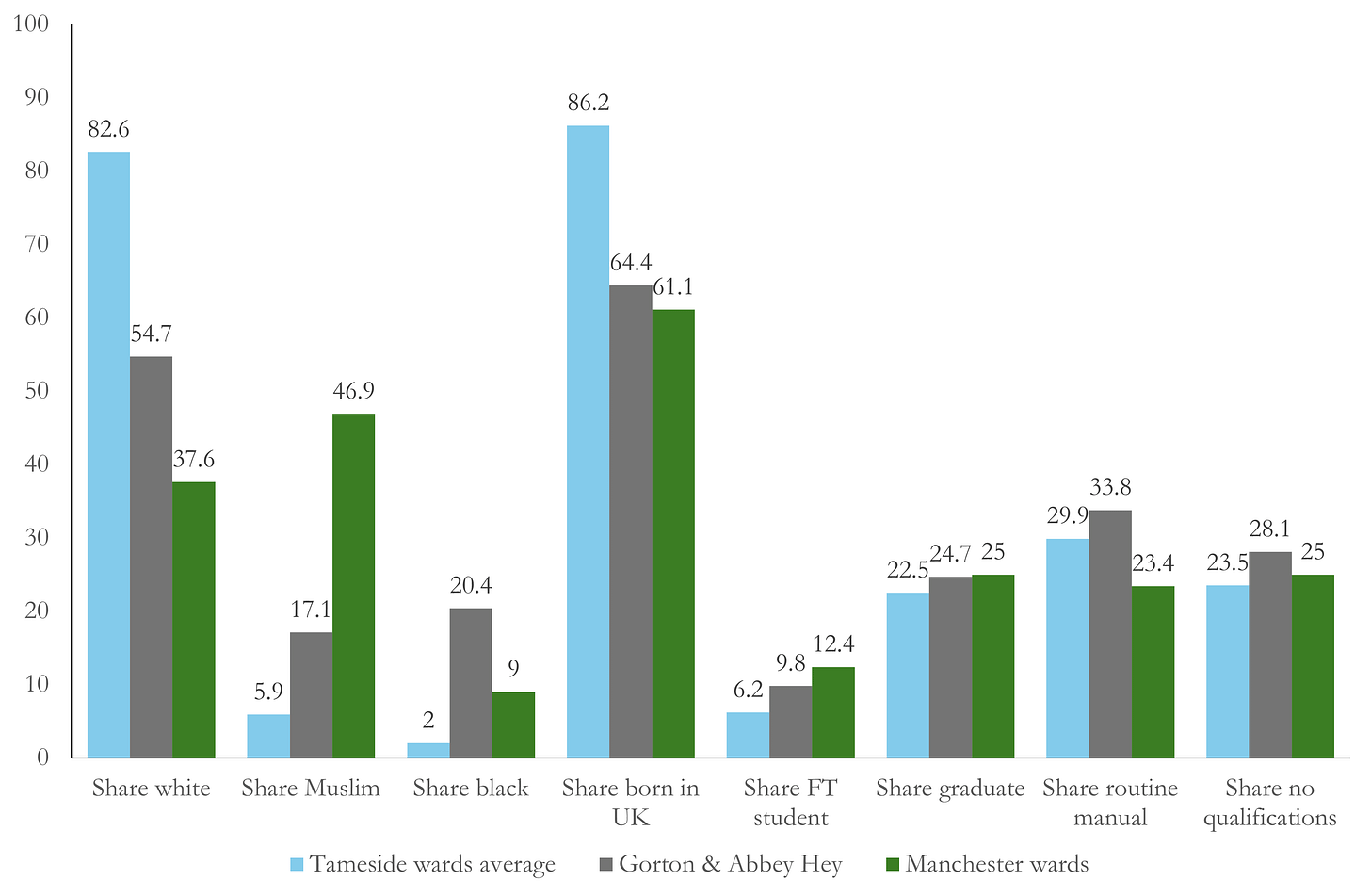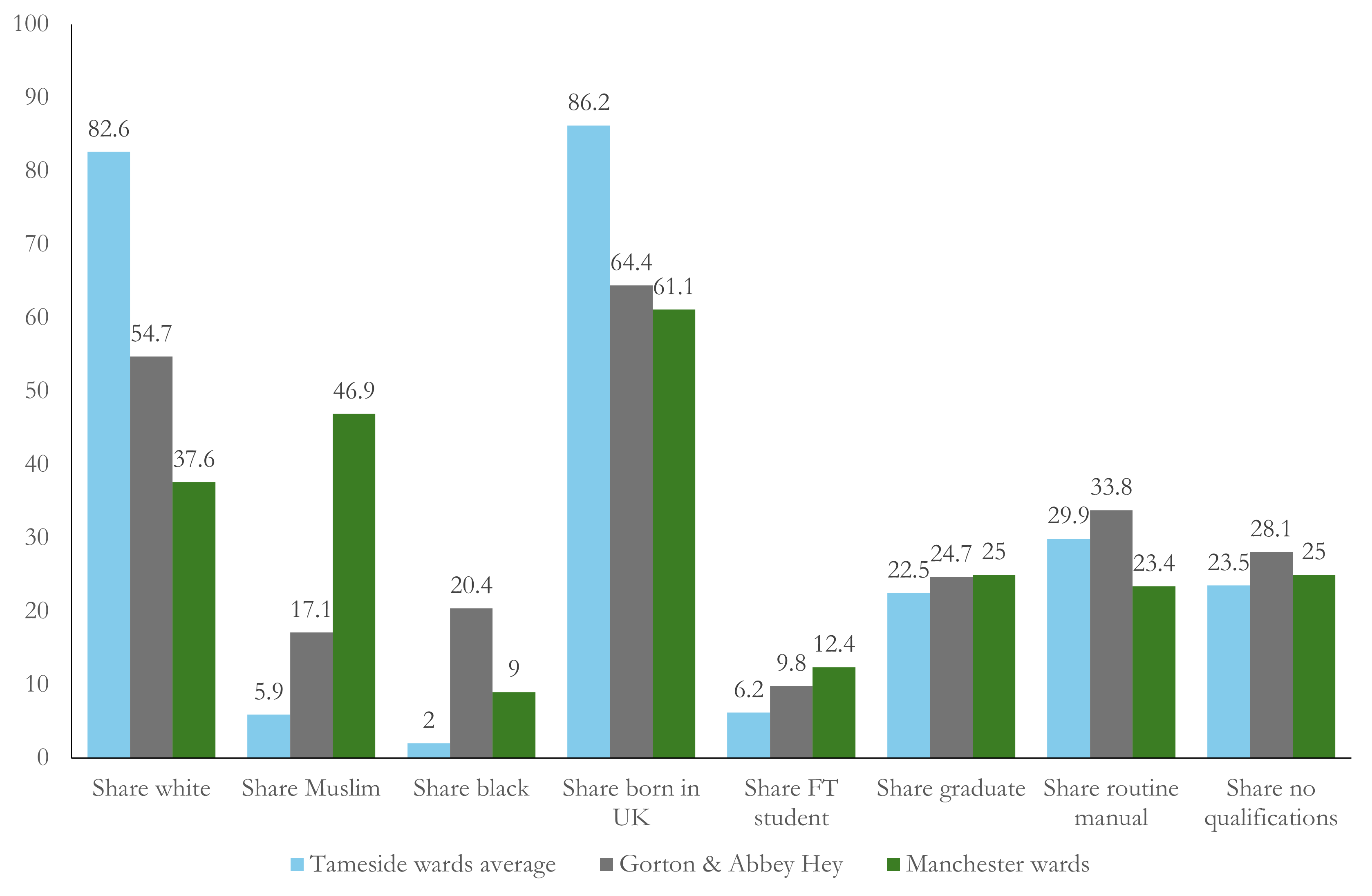 Demographics of the Tameside wards (blue), the Manchester wards (green) and Gorton & Abbey Hey (grey)