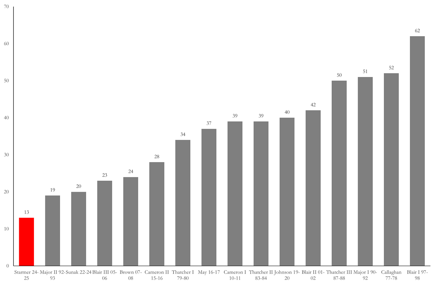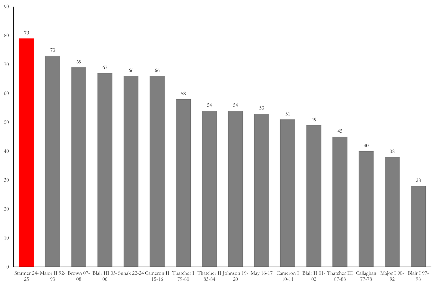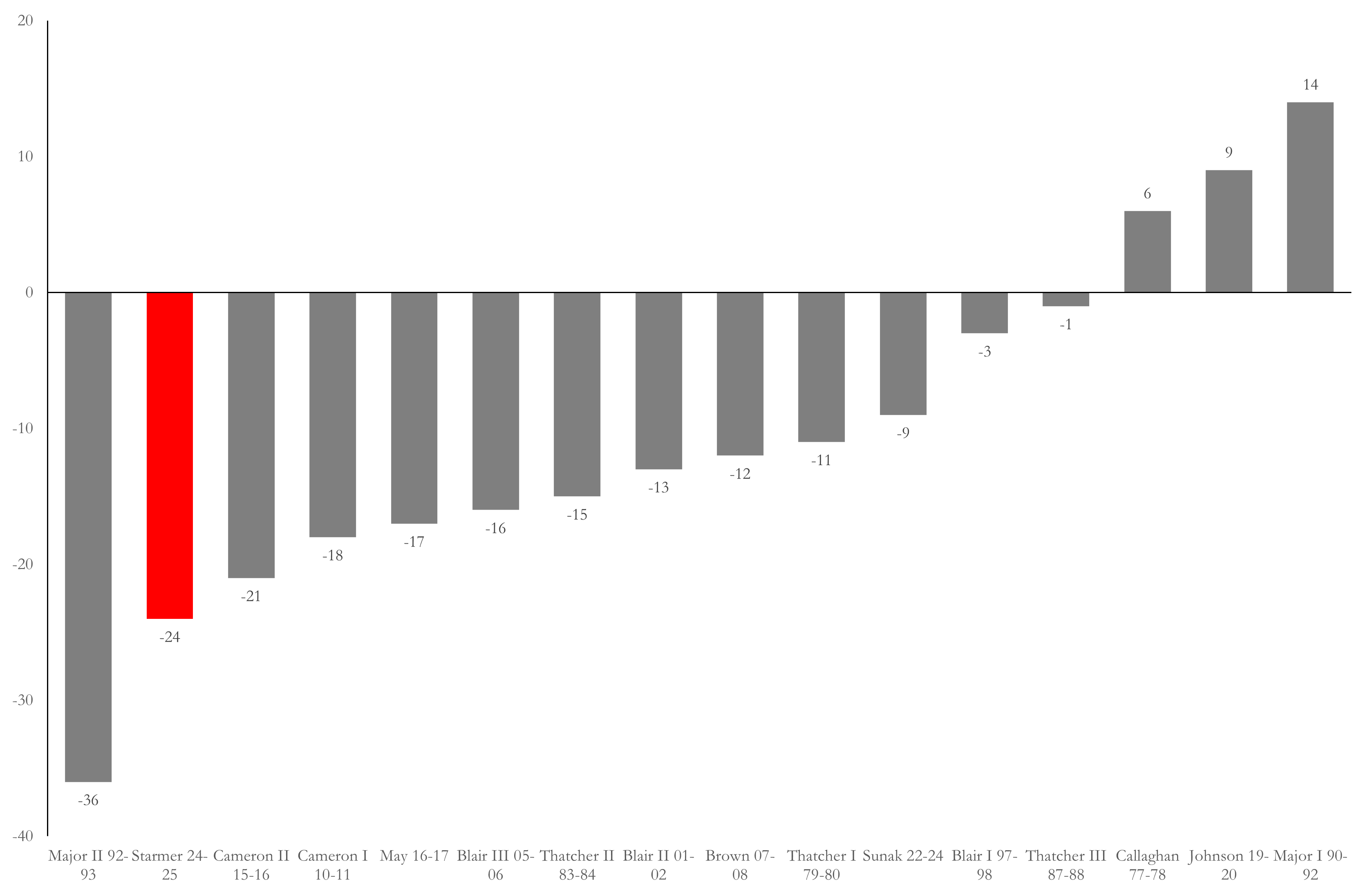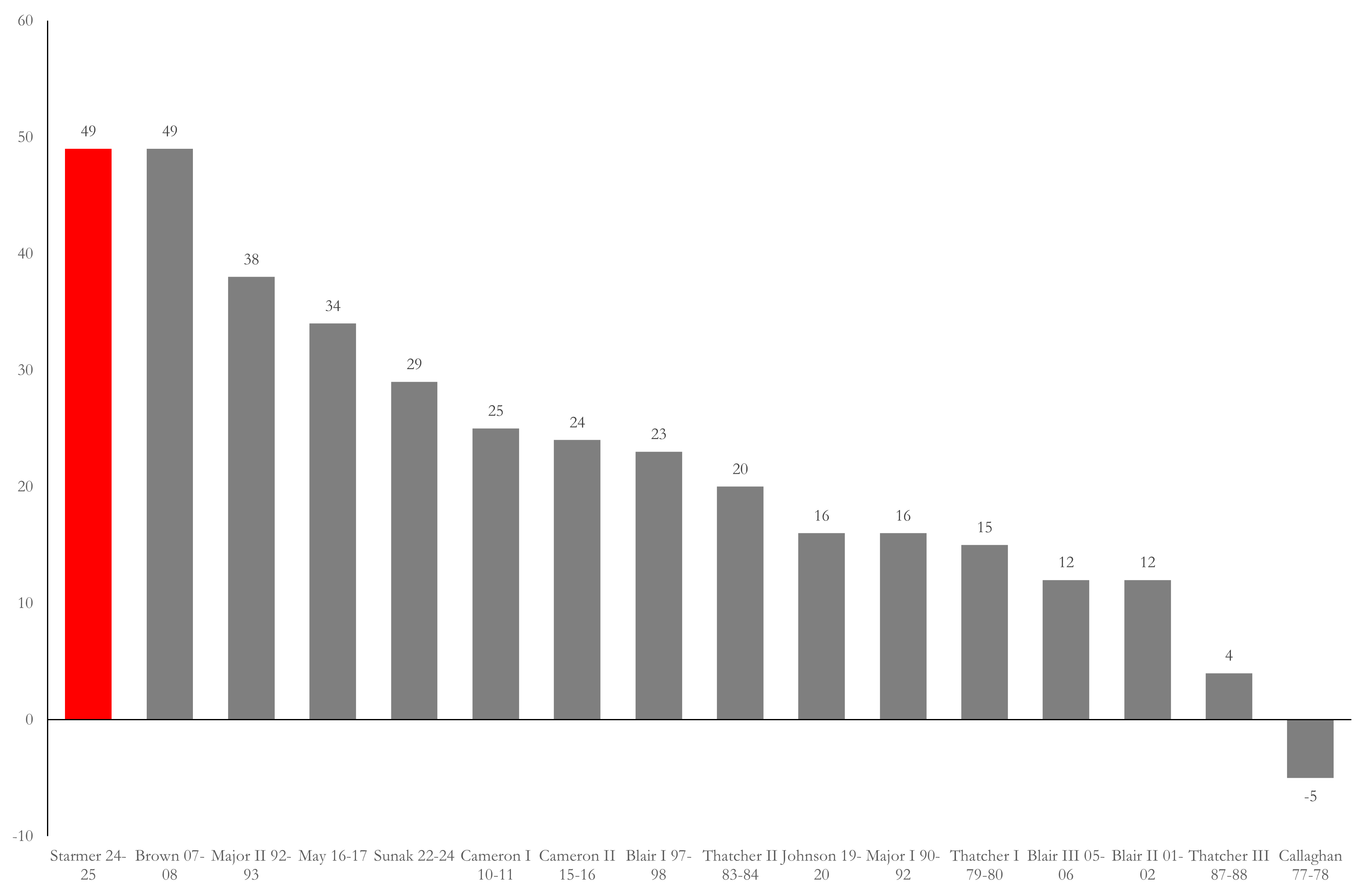 The picture is almost as grim when we look at the size of swings against governments in the first14 months after an election. Support for Starmer’s Labour has dropped by nearly 14 points in the first 14 months after the election, the second largest drop in post-war political history, and four times the average post-election polling drop of 3.5 points. Only John Major, presiding over economic chaos in the wake of the Exchange Rate Mechanism crisis, fell further and faster in his opening year and a bit. And while most governments suffer an early slide, Starmer’s polling slump contrasts starkly with the warm welcome received by the last two Labour Prime Ministers taking office after a long period of Tory rule - support for Labour rose by over seven points during the opening phase of Harold Wilson’s 1964 government, while for Tony Blair, polls could only get better , as he rose by a record 8.6 points in his first 14 months after the 1997 election.