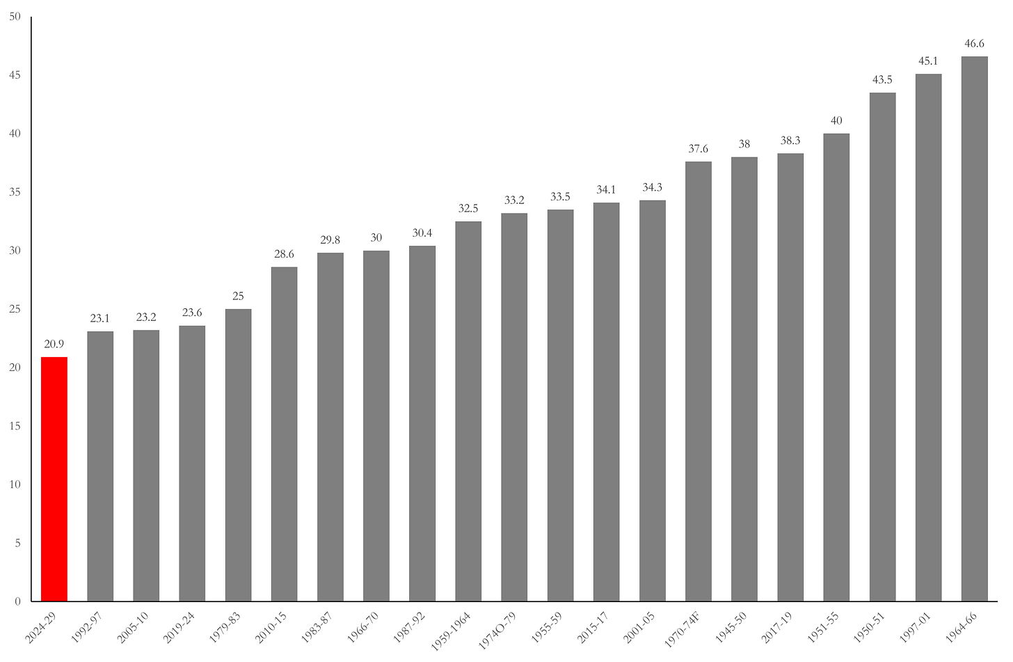 Figure 1: Lowest governing party monthly poll averages at mid-term 1945-2025, lowest to highest