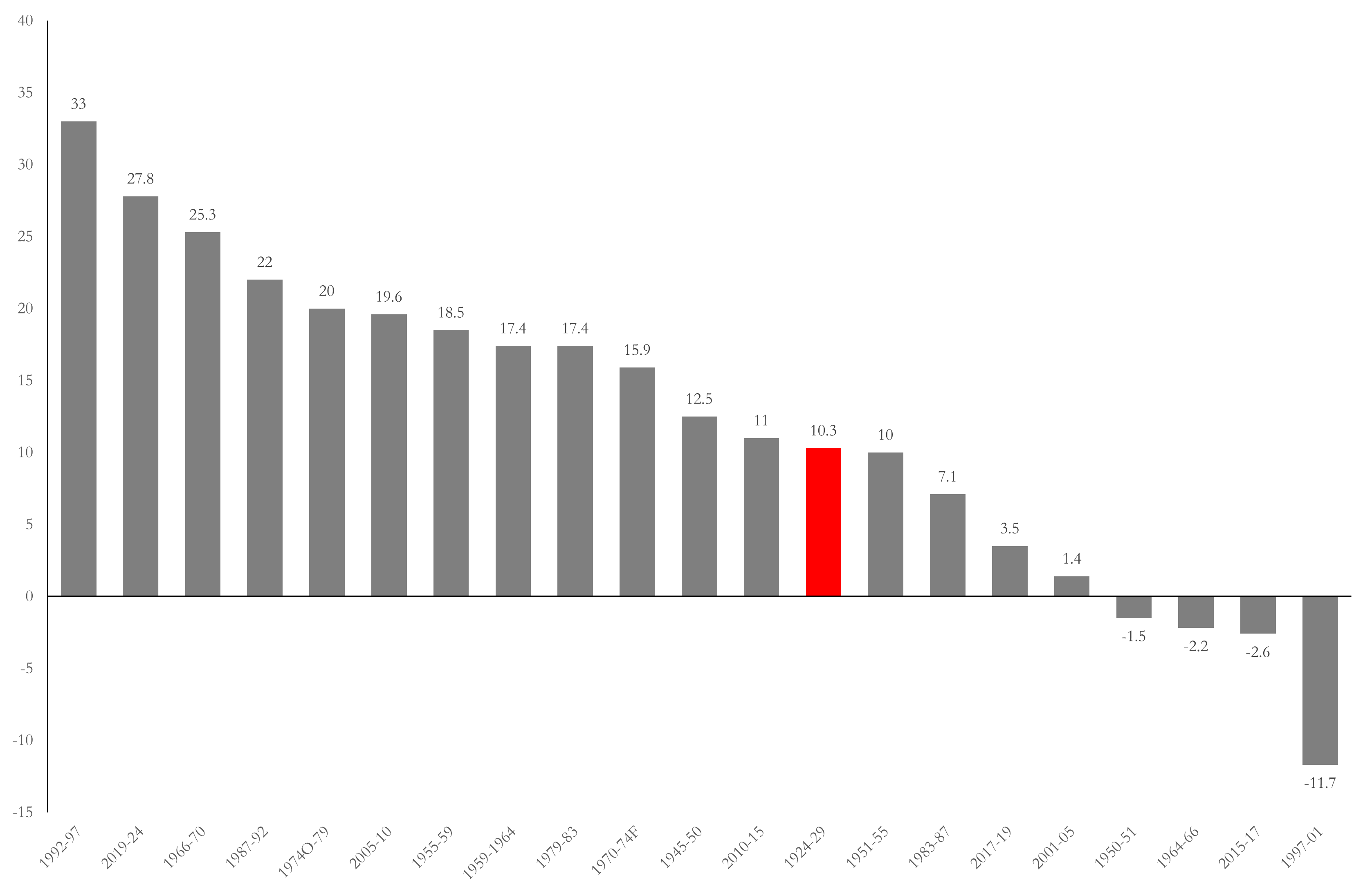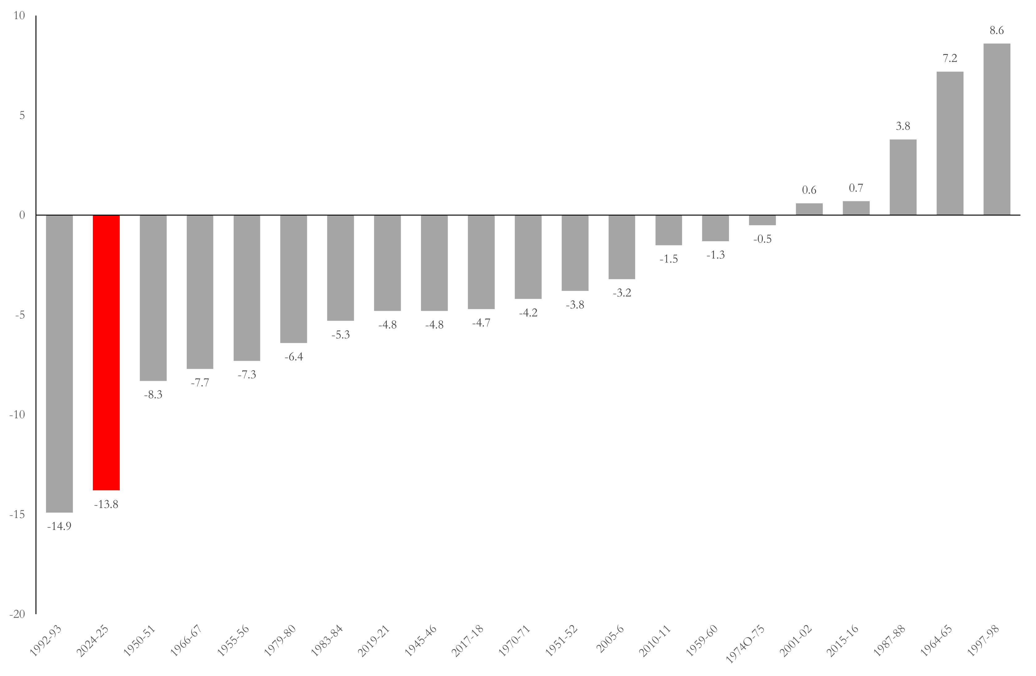 Figure 2: Drop in governing party support over 14 months 1945-2025, largest to smallest