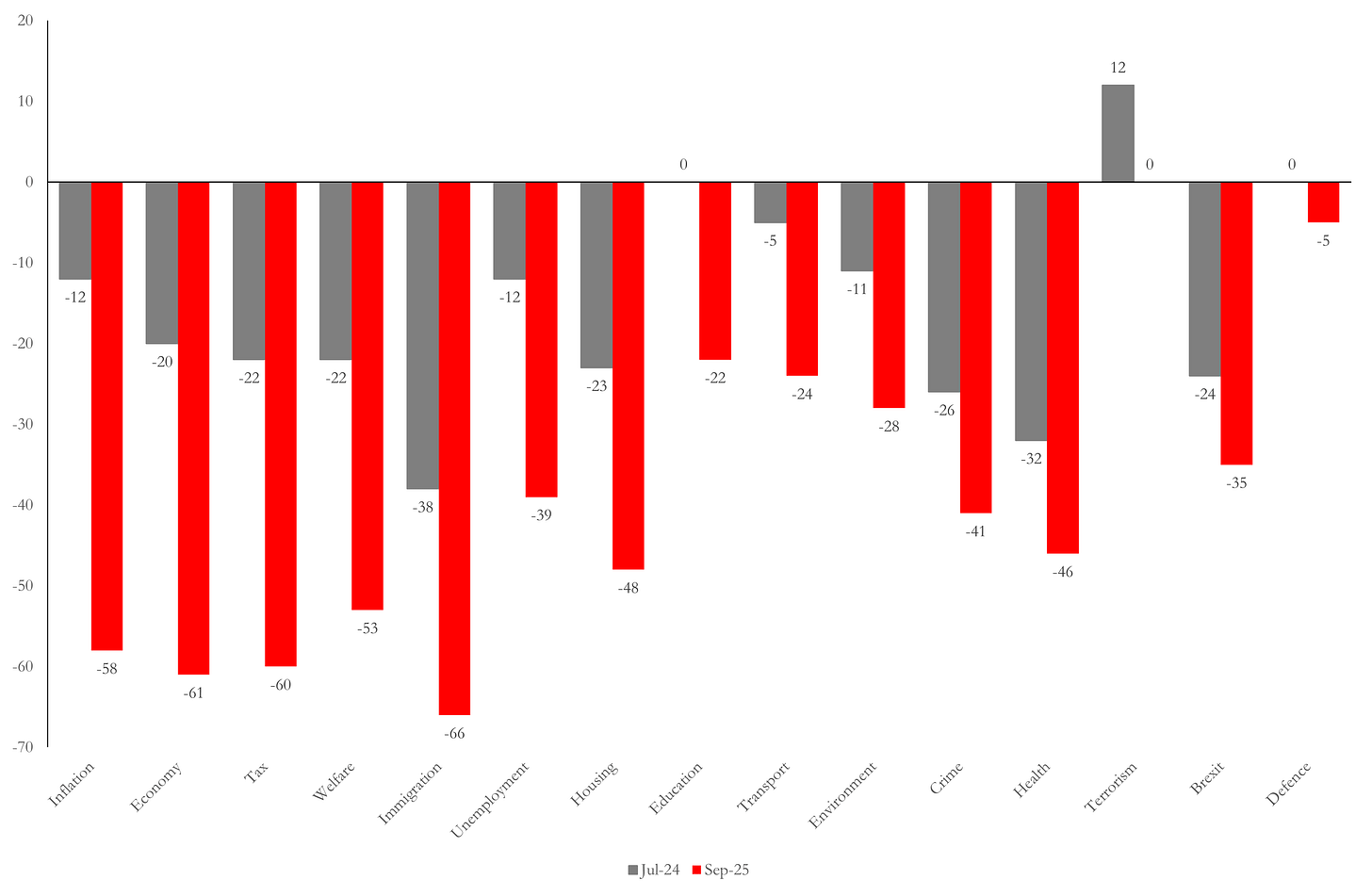 Figure 8 - Net approval of Labour performance on issues July 2024 (grey) and September 2025 (red) ordered from largest to smallest decline