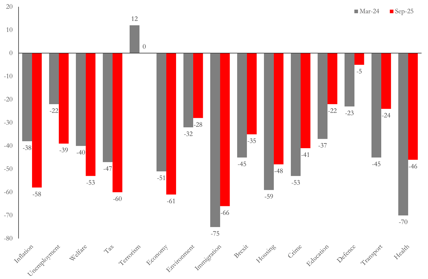 Figure 9: Ratings of the Sunak Conservative government in March 2024 (grey) and the Starmer Labour government in September 2025 (red)