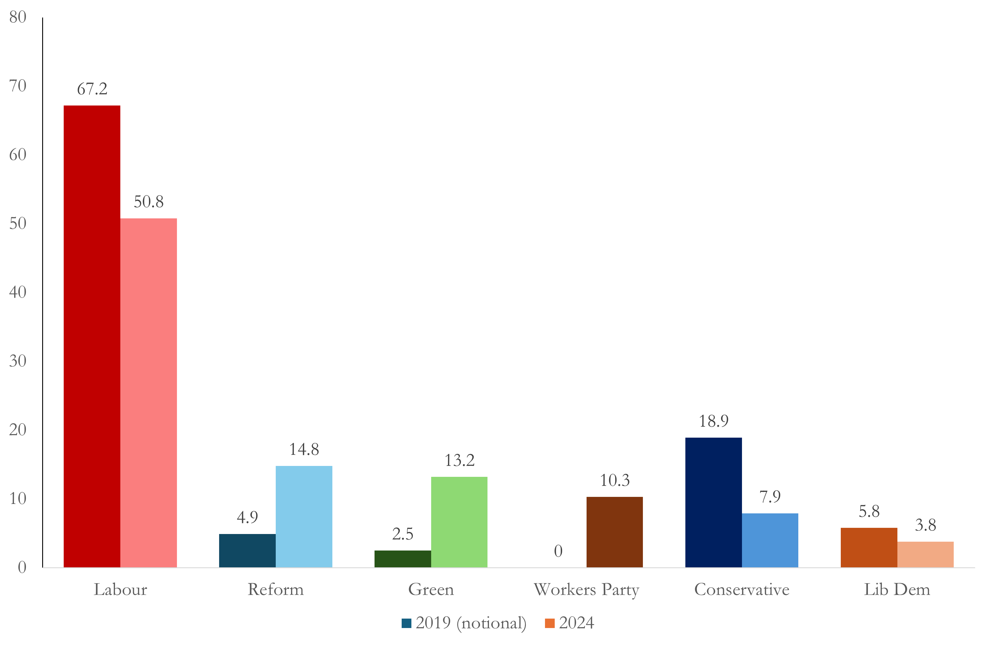 Dark bars on left - 2019 notional results (Rallings and Thrasher); light bars on right - 2024 results