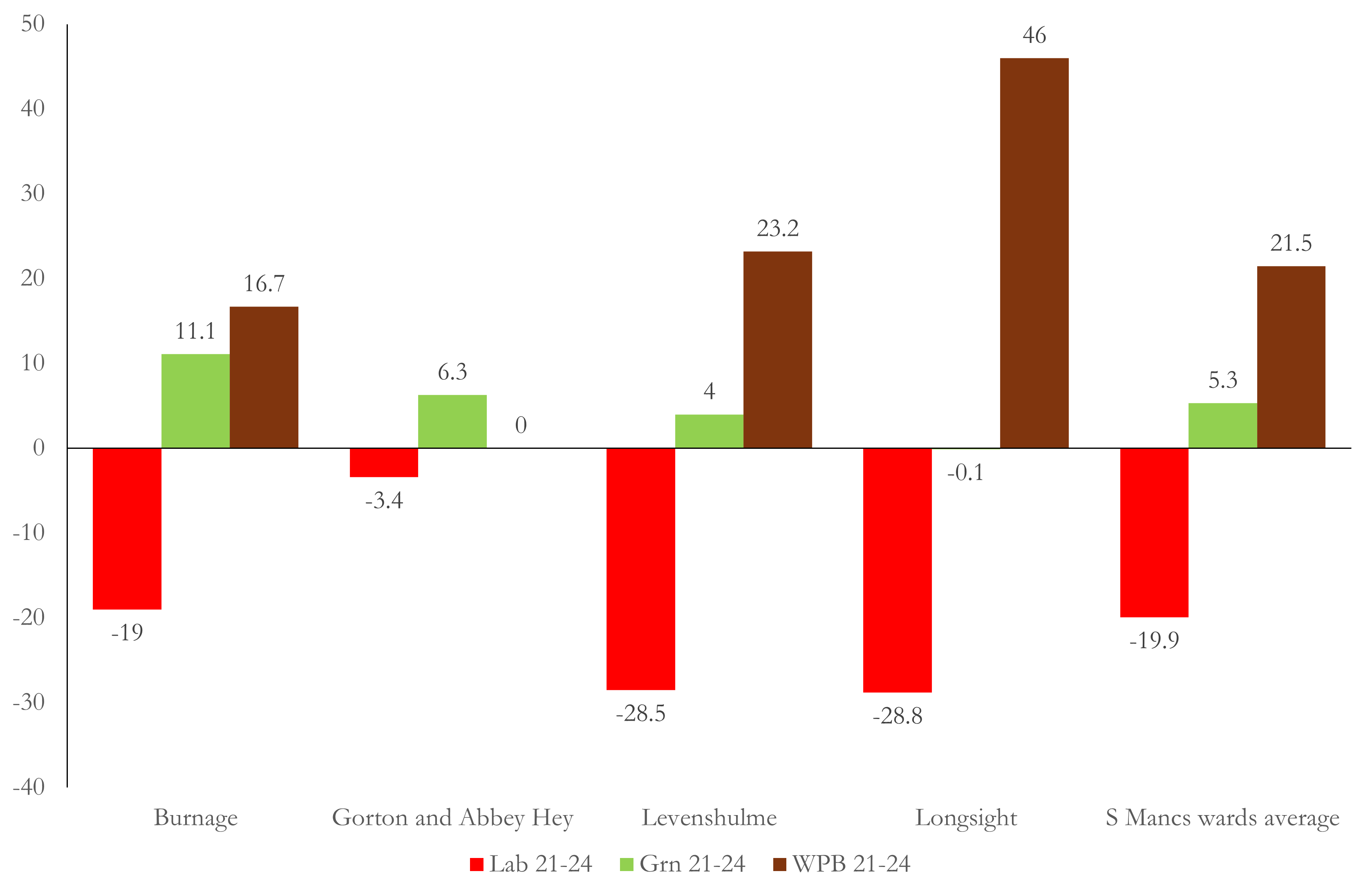 Changes in Labour, Green and Workers’ Party of Britain vote in the Manchester council wards of Gorton and Denton 2021-24